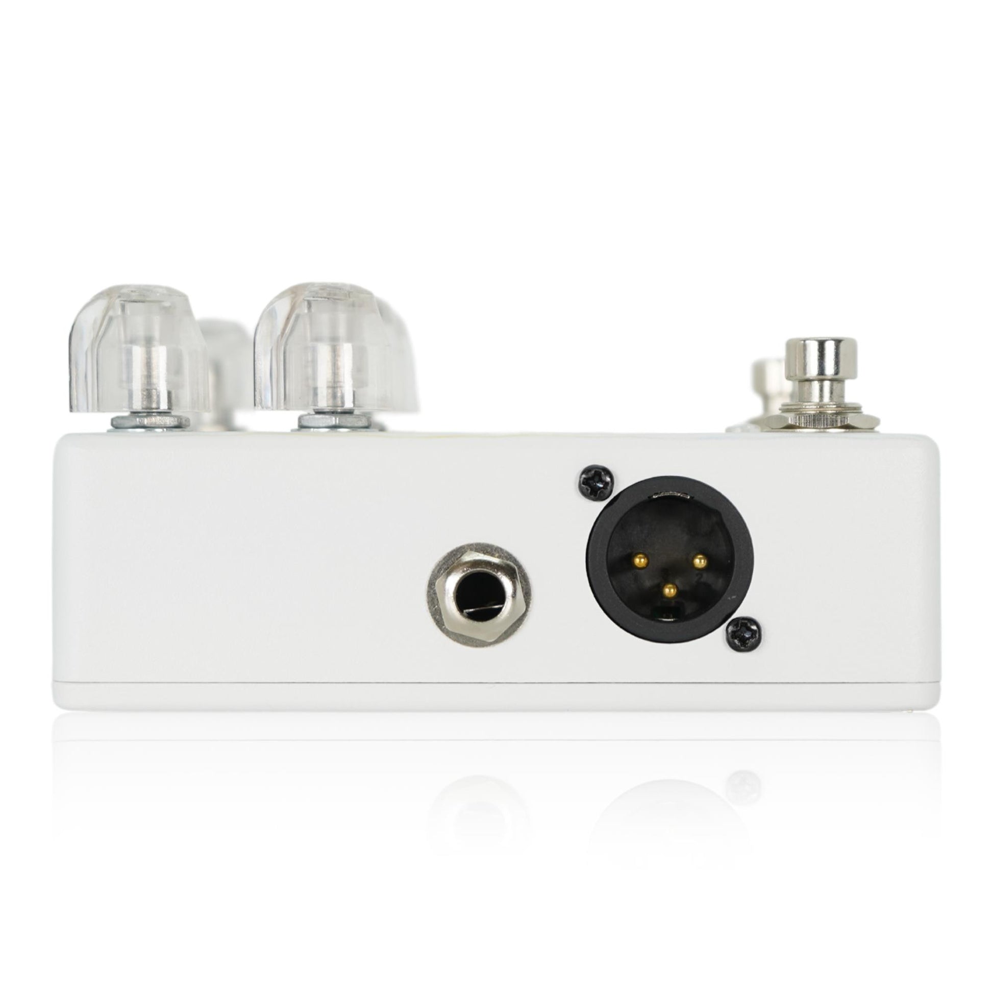 The GAIN control is active when BOOST ON, and can add light saturation to the tone, giving you more power, crisp edges, and authoritative presence to your acoustic guitar sound in the mix. Around the left side of the FADI is an effects loop, where you can put other effects like chorus and delay at the same time when using an acoustic guitar or as a boost pedal. The balanced output XLR can easily send your signal to the mixer directly with a great signal for the sound engineer. You can power the Firewood Acoustic DI directly from 48v phantom power if you wish, which can be helpful on small or outdoor stages where there might be a shortage of outlets. If you power the FADI with an adapter, it is equipped with a DC OUT jack so you can daisy-chain power your other pedals easily.