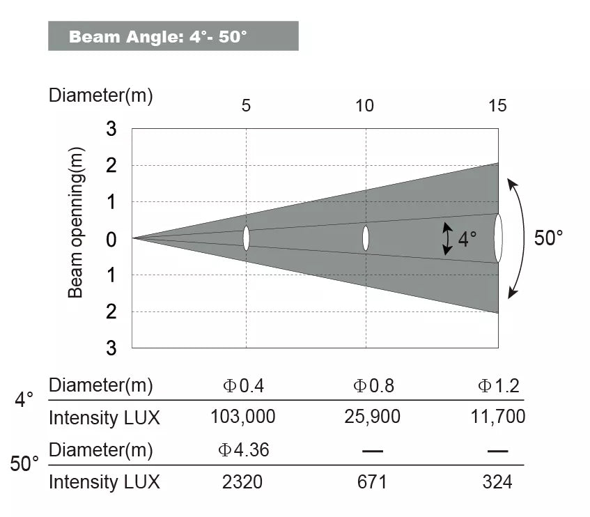 - Beam Angle: 4°-50°