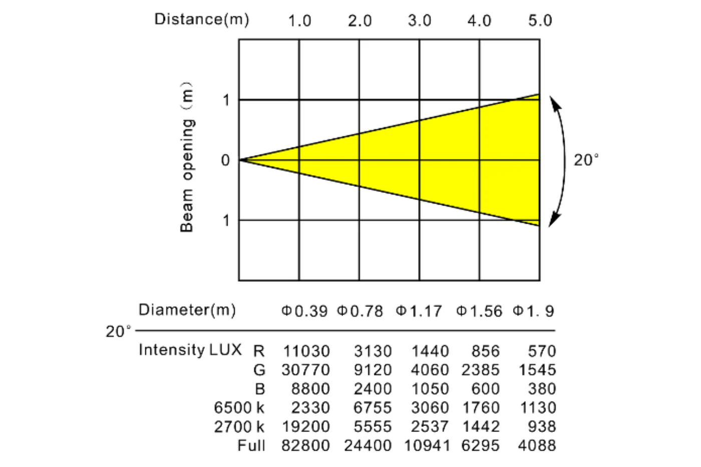 - Operational Modes: Static, Color Fade, Auto Program, Sound Active, Master / Slave & DMX Modes, RDM, WDMX