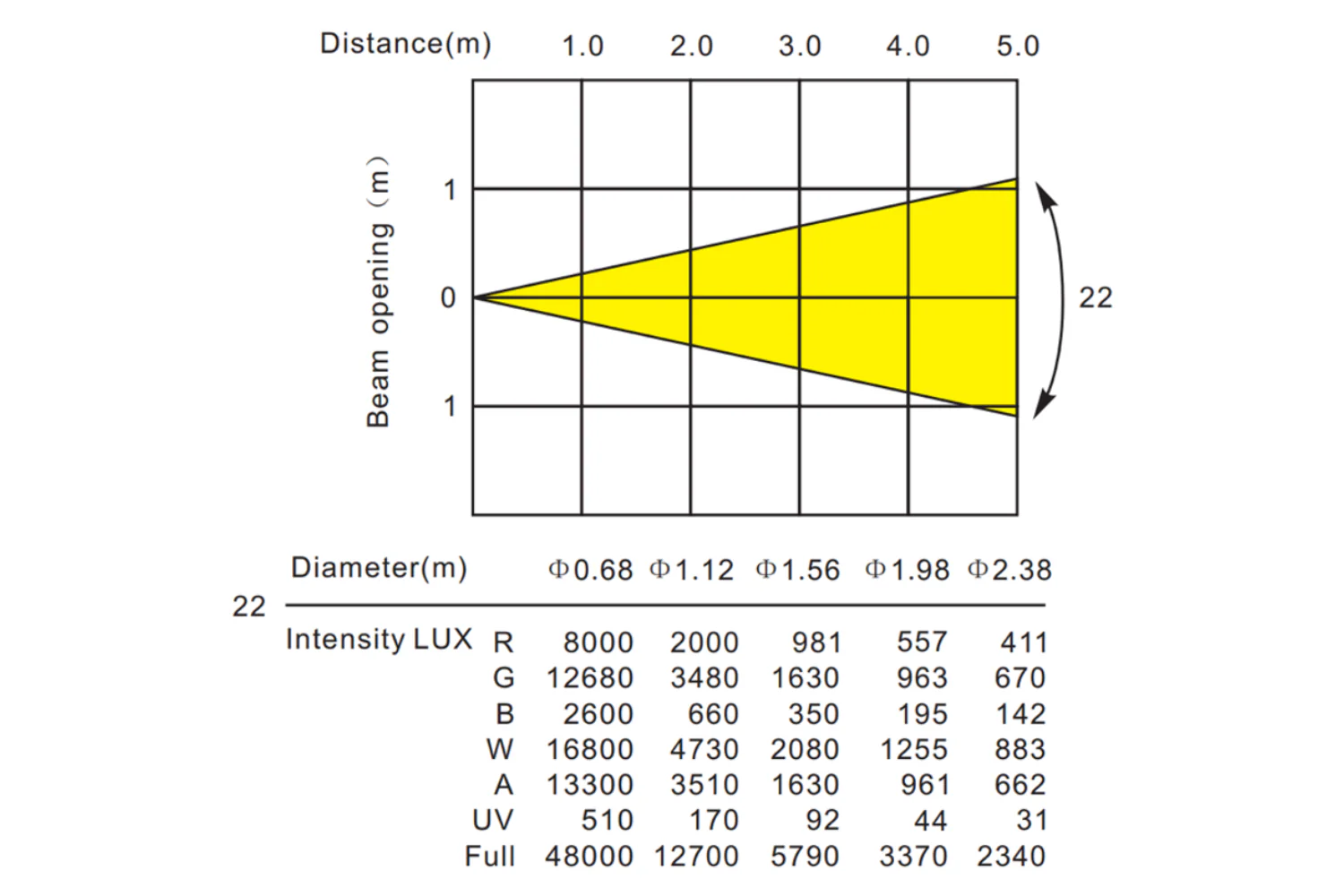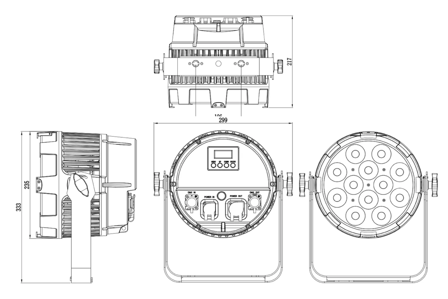 - Operational Modes: DMX, WDMX, auto run, sound active, master/slave, manual, static, RDM