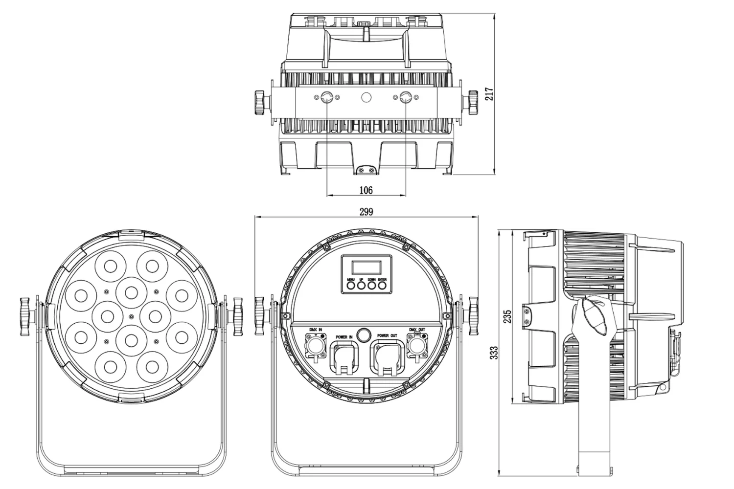 - Operational Modes: DMX, WDMX, auto run, sound active, master/slave, manual, static, RDM